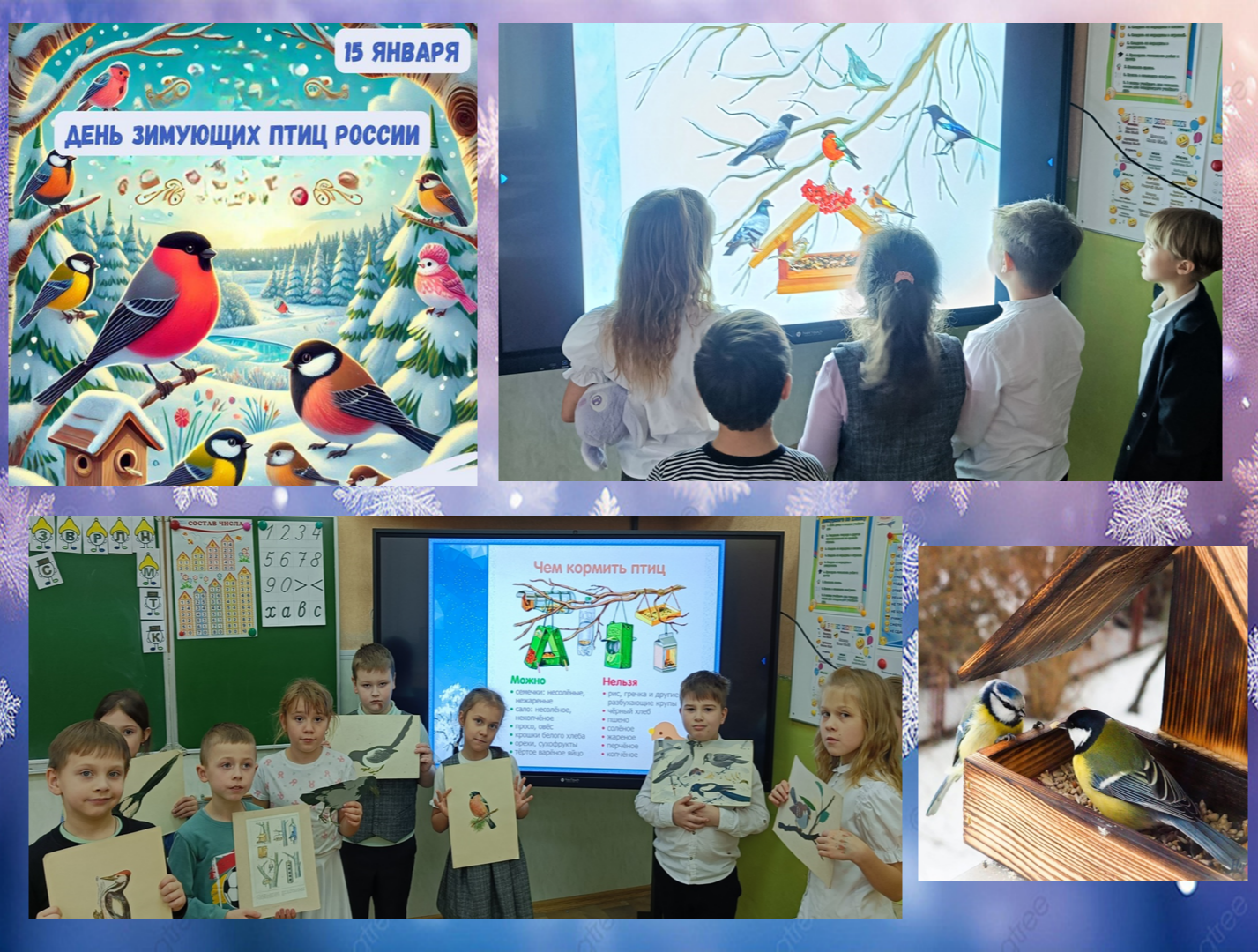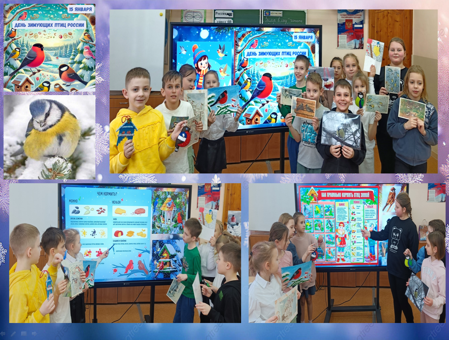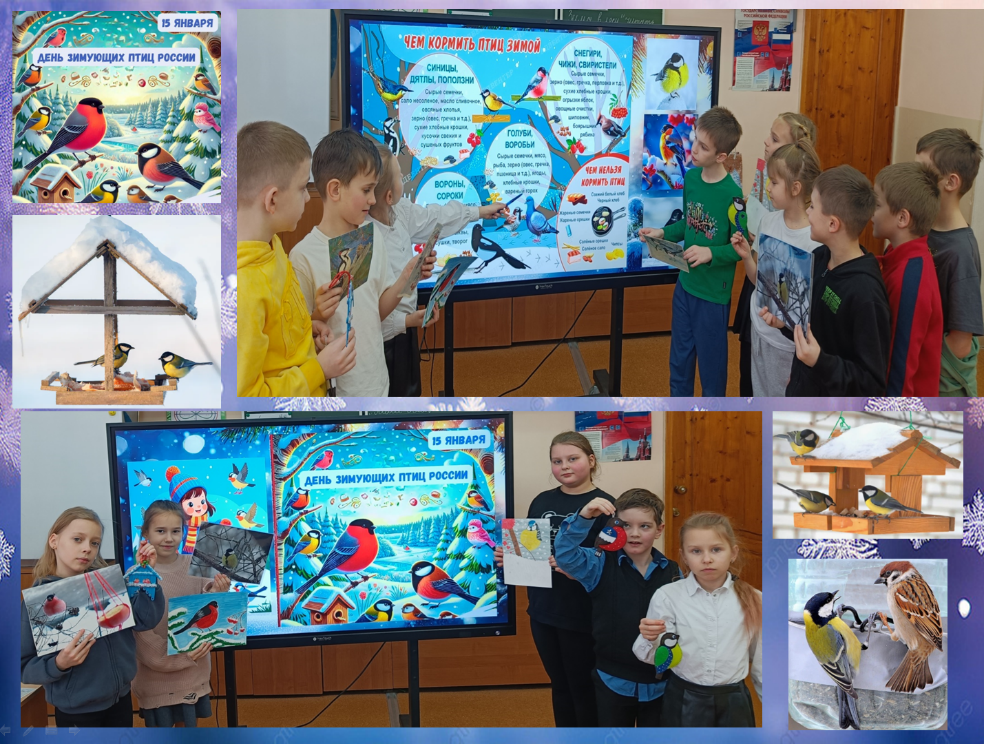 В рамках Дня зимующих птиц 15 января (экологическая дата, призванная напомнить о важности заботы о пернатых, остающихся с нами в холодное время года) обучающиеся творческих объединений «Друзья природы», «Юные дизайнеры» СОГБУ ДО «Станция юннатов» (педагоги ДО Бершак И.А., Бершак Ю.В.) с интересом приняли участие в беседах: «Как живут наши пернатые друзья зимой?», «Зимующие птицы Смоленского края», «Чем подкармливать птиц зимой», рассказали о своем личном участии в акции «Покормите птиц зимой!», узнали много нового о повадках птиц, их характерных особенностях.